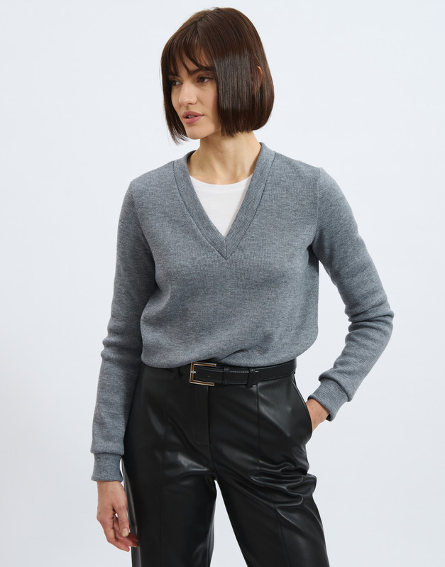 Джемпер малого объема, прямого силуэта, длиной до линии бедер. На детали переда, по боковому срезу, в размерах 38-46 заложена посадка, в размерах 48-62 нагрудная вытачка из бокового шва. В зависимости от выбранного вами материала и размера изделия, вытачку можно стачать или сутюжить раствор вытачки. Горловина переда имеет V-образный вырез, обработана обтачкой. Рукав втачной, одношовный. Низ рукава обработан притачной манжетой шириной 6,0 см. Длина рукава в готовом виде ниже линии запястья.